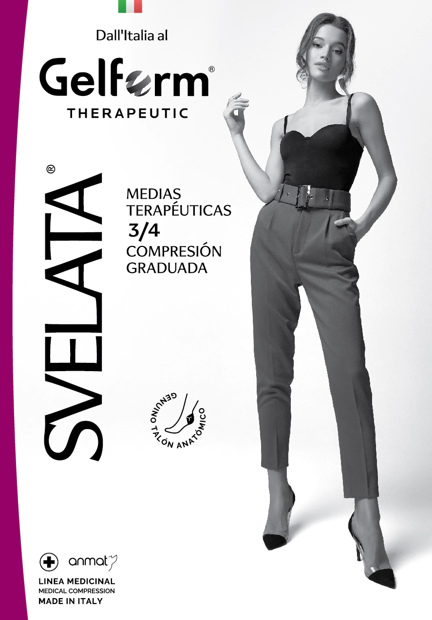 SVELATA® es una línea completa de pantymedias y medias 7/8 y 3/4, desarrollada en Italia por Gelform Therapeutic, diseñada para brindar tratamiento médico especializado. Cada modelo de SVELATA® ejerce una compresión graduada diferenciada y precisa en tobillos, pantorrillas y muslos, favoreciendo una mejora significativa en la circulación sanguínea.
